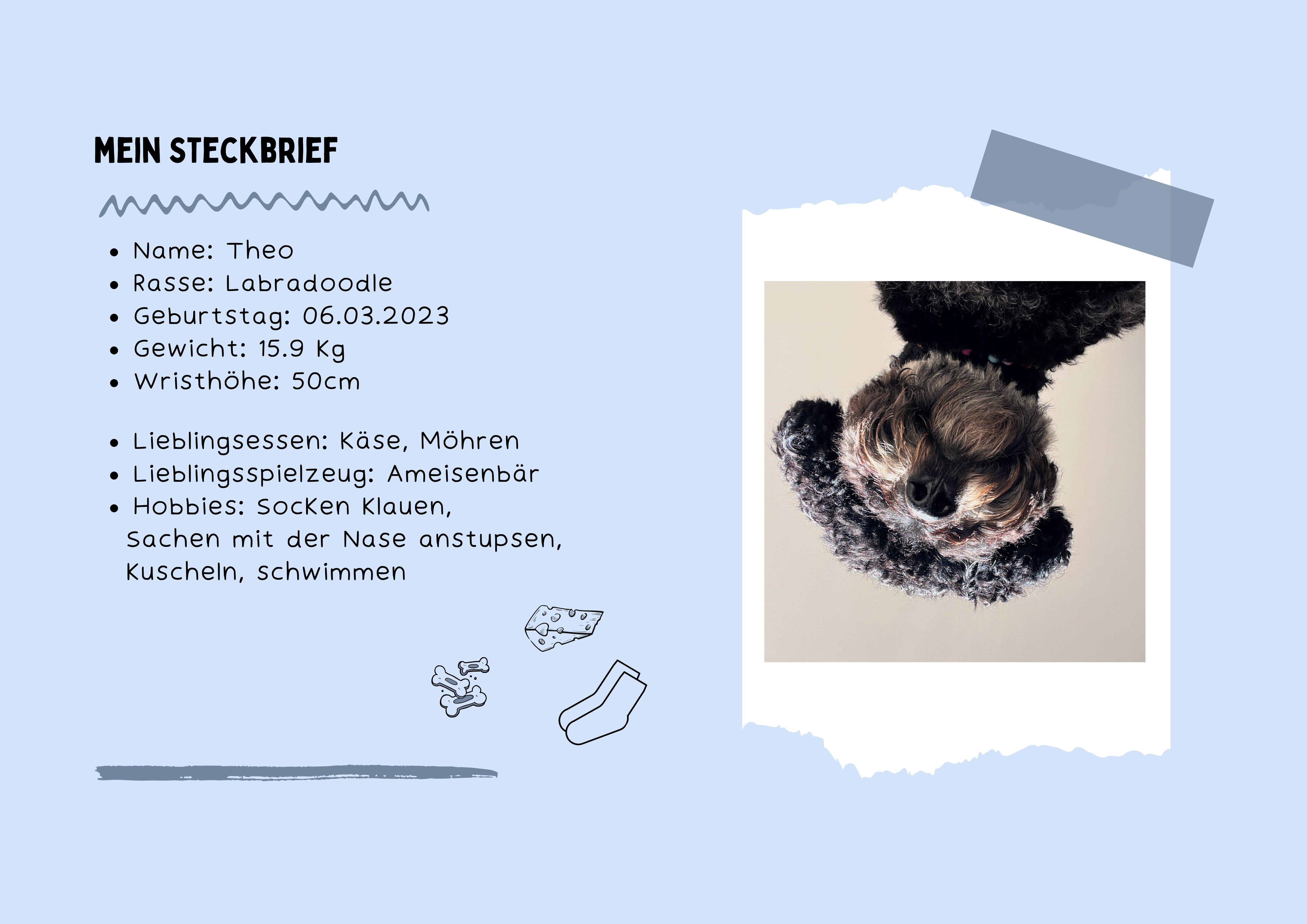 Theo ist ein Labradoodle - eine Kreuzung aus Labrador und Pudel. Diese Rasse gilt als sehr intelligent, freundlich und anpassungsfähig. Zudem sind sie hypoallergen, sie verlieren kaum